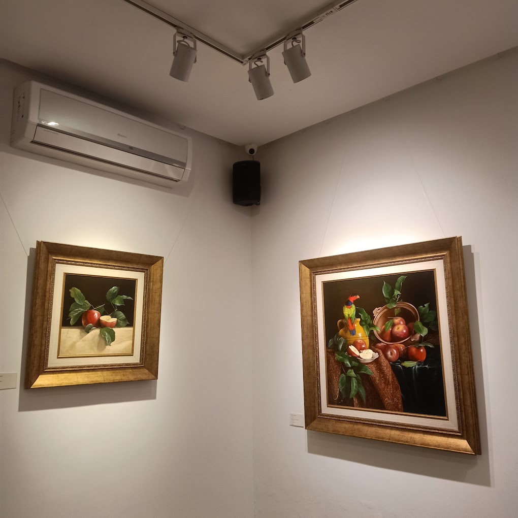 The gallery showcases paintings, sculptures, ceramics, and photography.